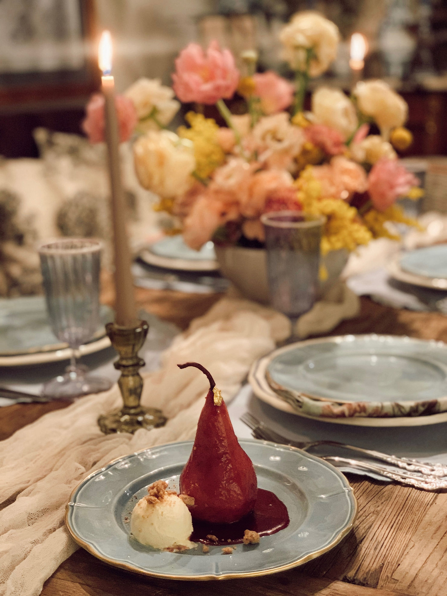 There is nothing worse than a host running in circles. Remember we want to maintain a seamlessly executed evening where you too as the host are enjoying your guests. We finished off with my mulled wine spiced pears.