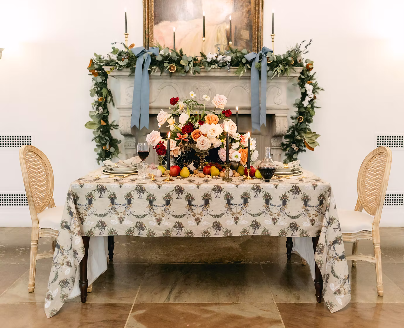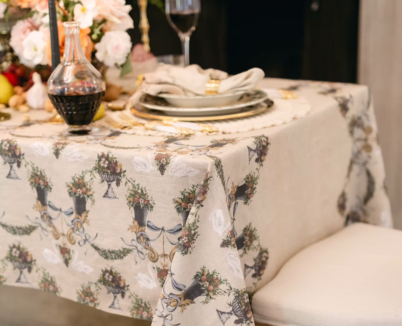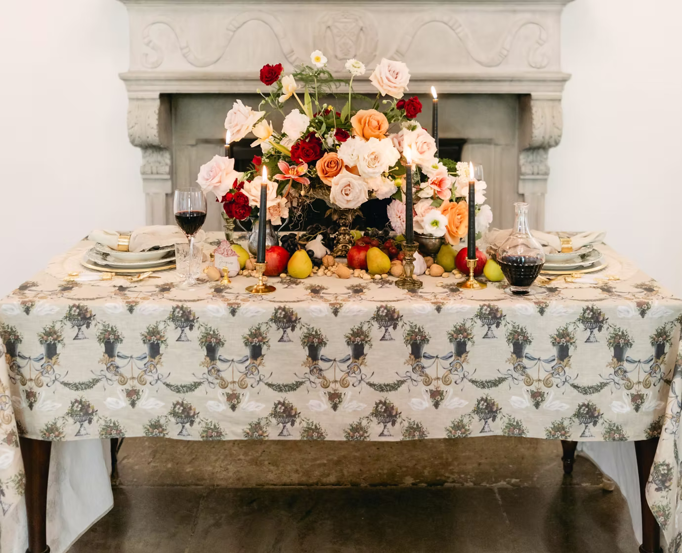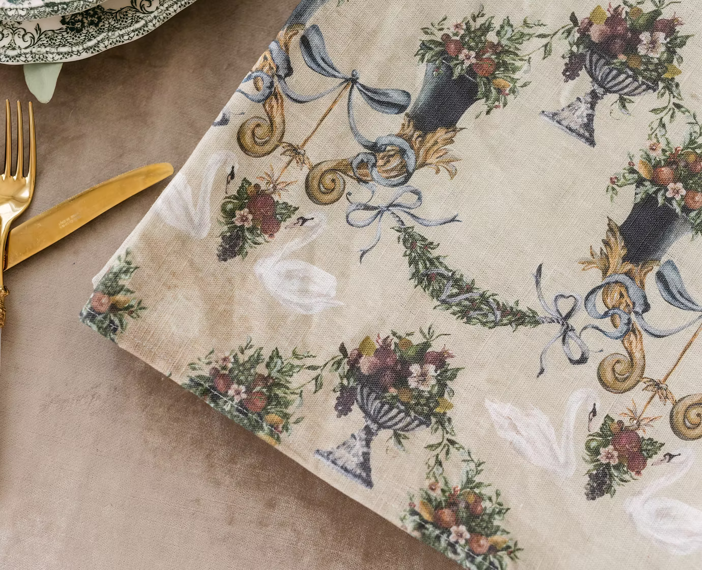 Drawing inspiration from lavish tapestries, featuring an intricate pattern of swans, ornate cornucopias, and festive festoons, all adorned with a stunning array of flora and fruits.