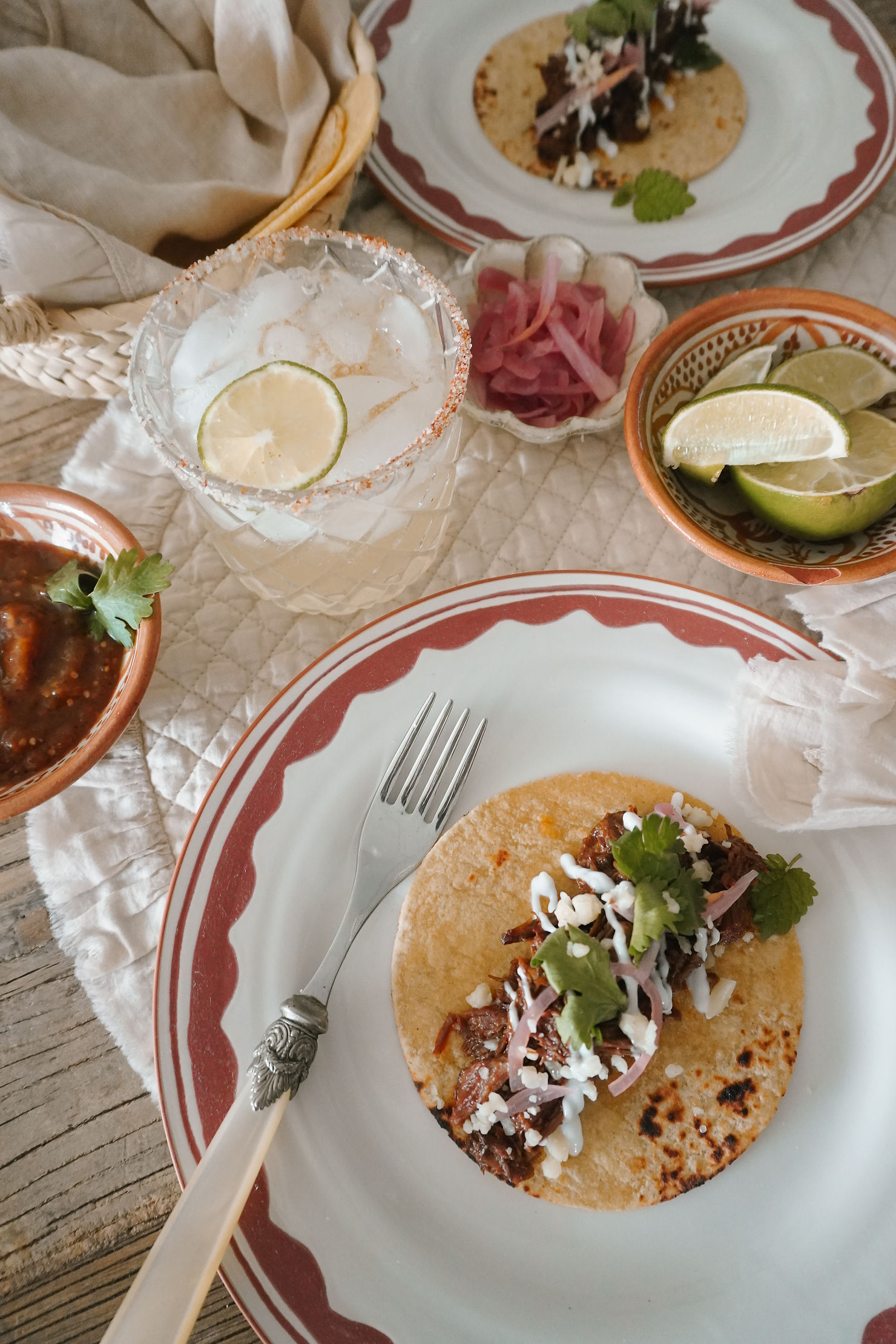 Serve with the tortillas, salsa and/or hot sauce, onion, cilantro and lime.