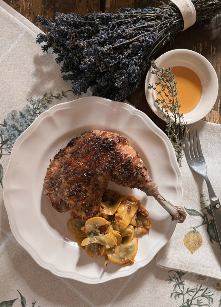 A dish that feels like a table filled with conversation. Fragrant honey and lavender melt into a savoury roast that’s both comforting and elegant, paired with a courgette fricot that keeps everything fresh and grounded. It’s the kind of meal meant to be served in the centre of the table, with everyone reaching in.