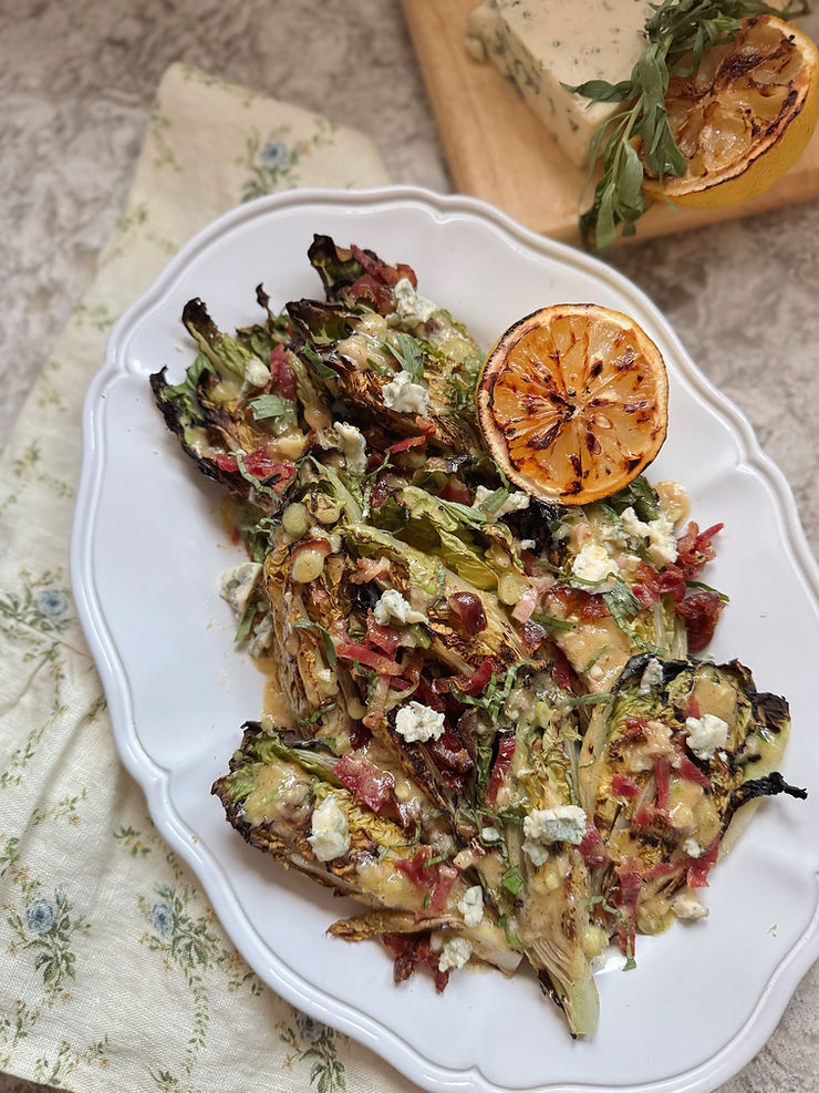 There’s a little spot in Santa Monica that makes the kind of salad you think about long after the meal is over—simple, but unforgettable. This is my take on that memory: grilled baby gem lettuce layered with crispy bacon, sweet dates, blue cheese, and a handful of fresh herbs.