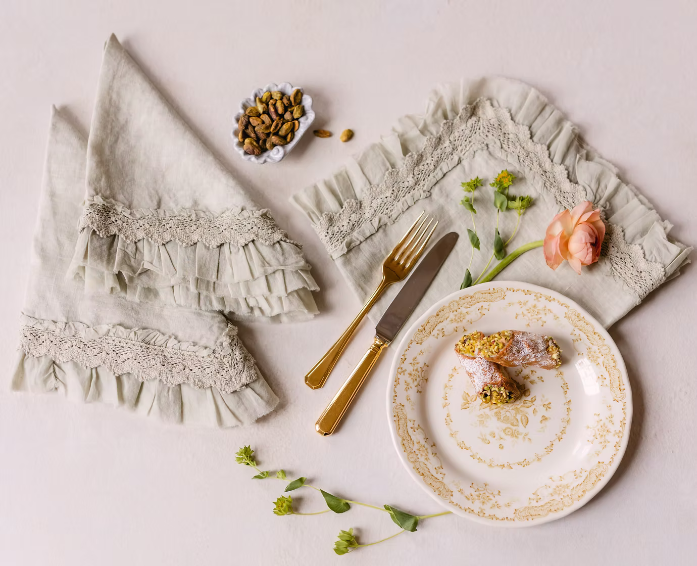 In a soft, sun-faded mint green, this napkin is crafted from airy linen and finished with a delicate embroidered trim and a refined ruffled edge.