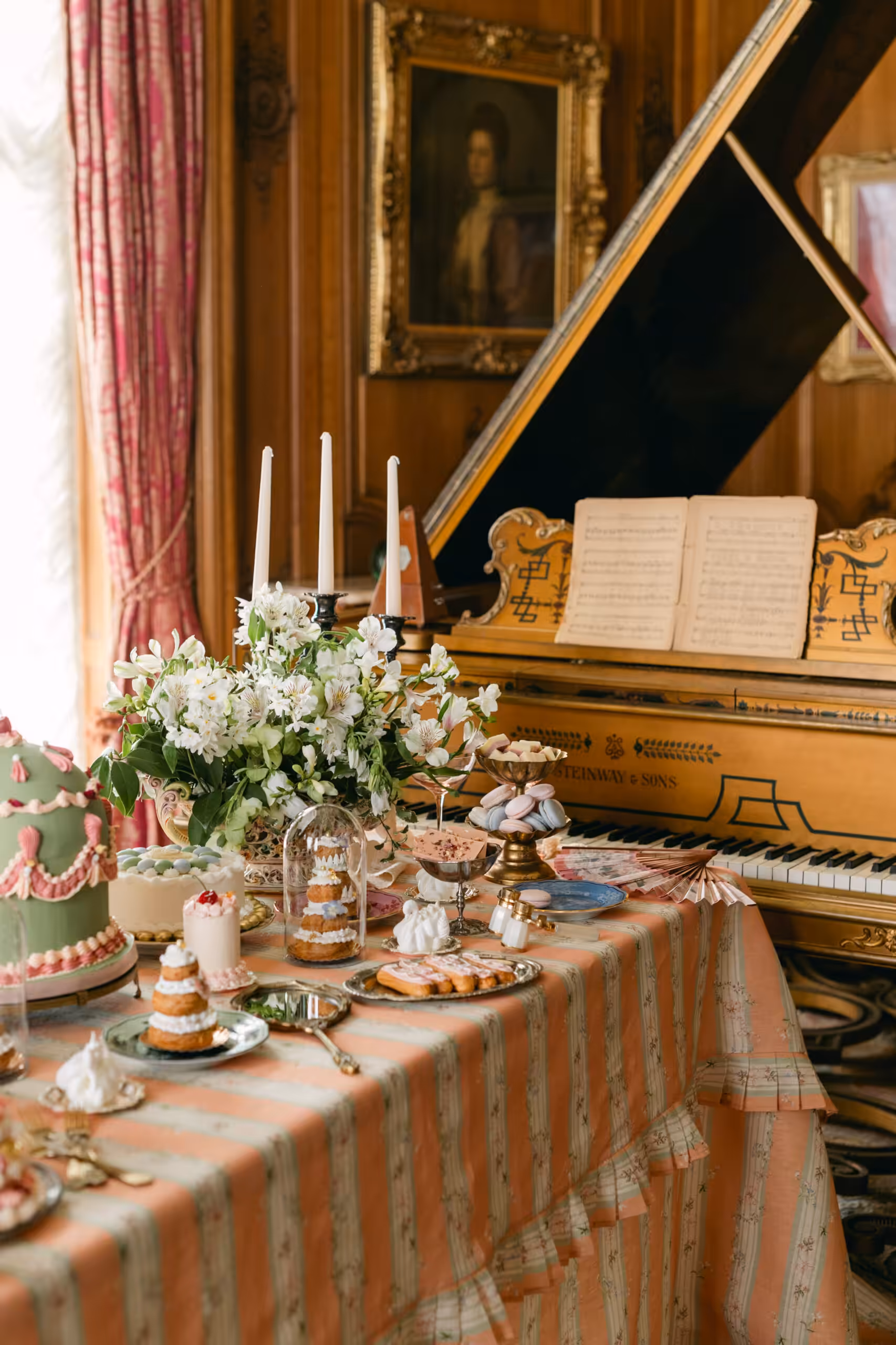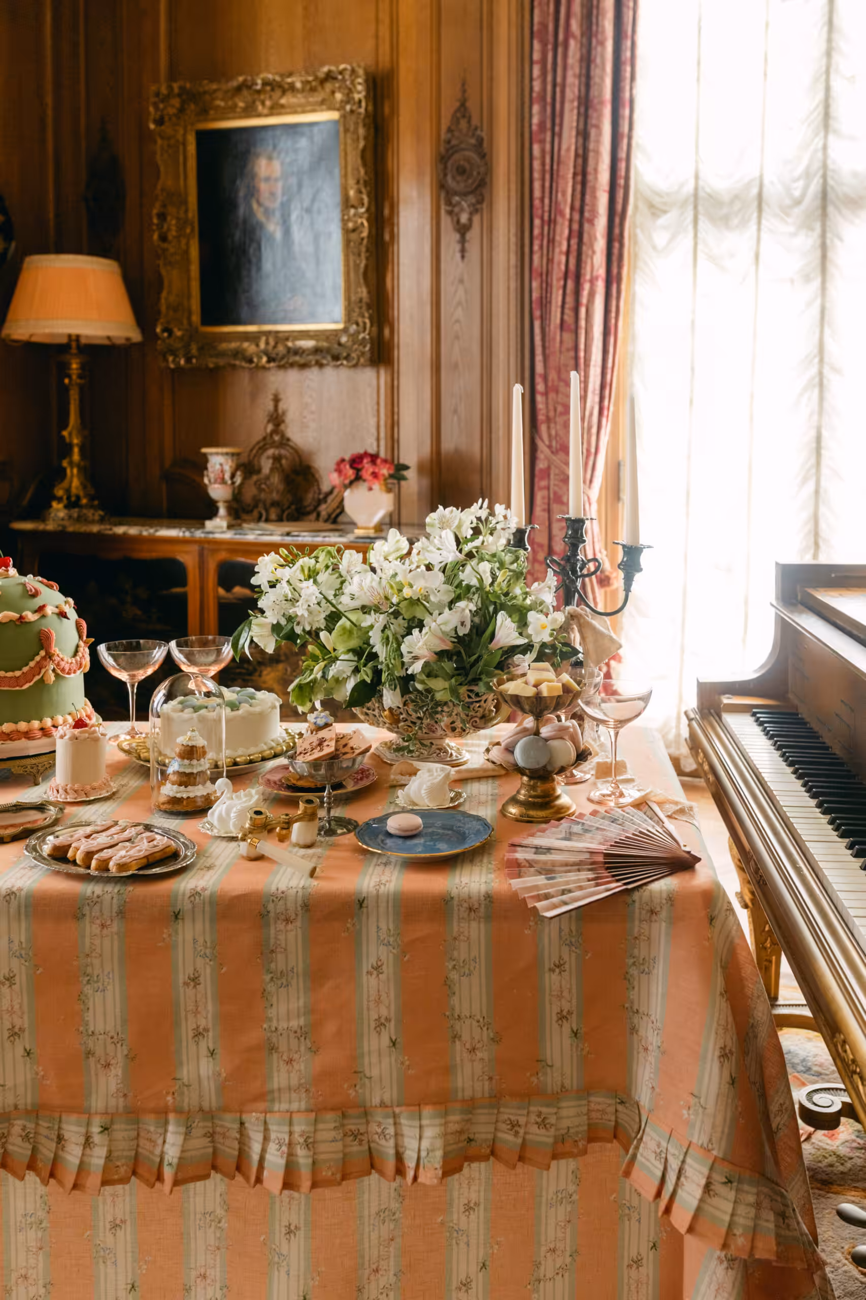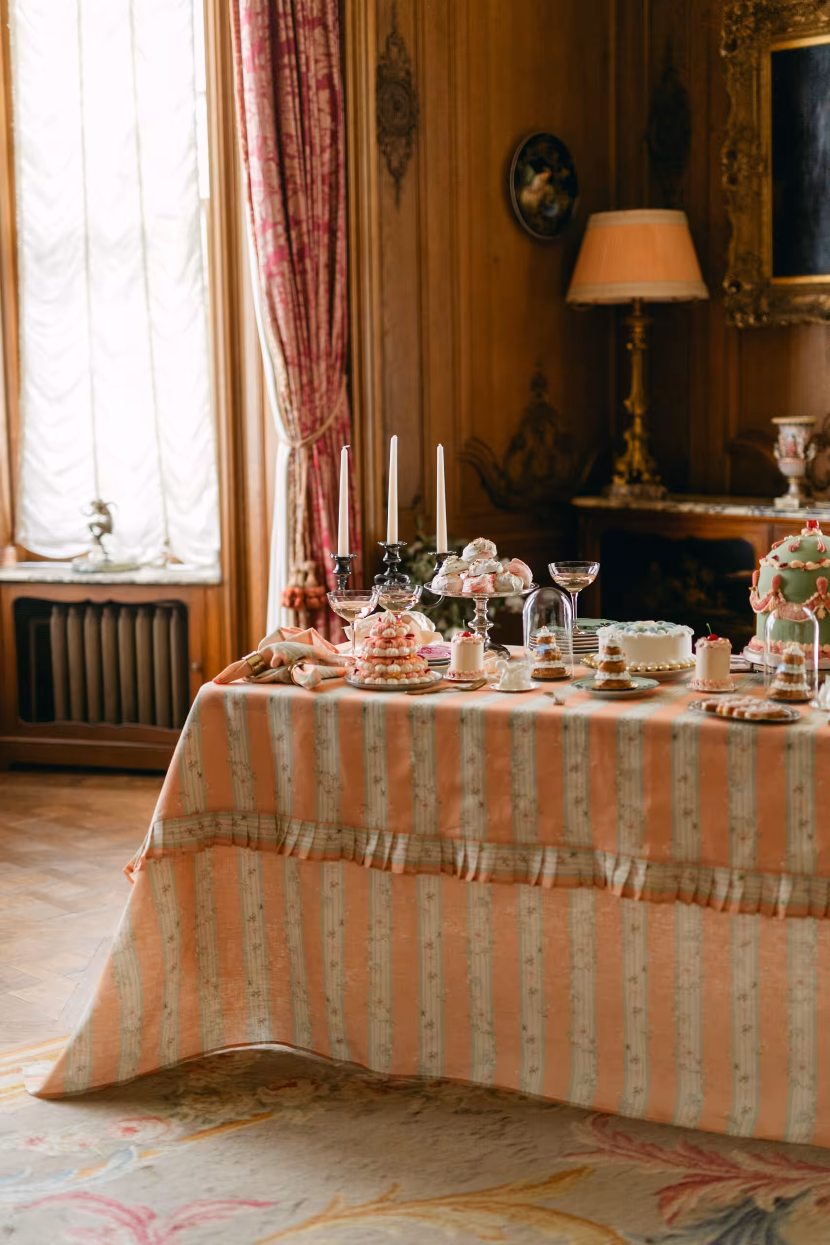 A drawing room tablecloth inspired by a Marie Antoinette gown and vintage French fabrics collected over time.
