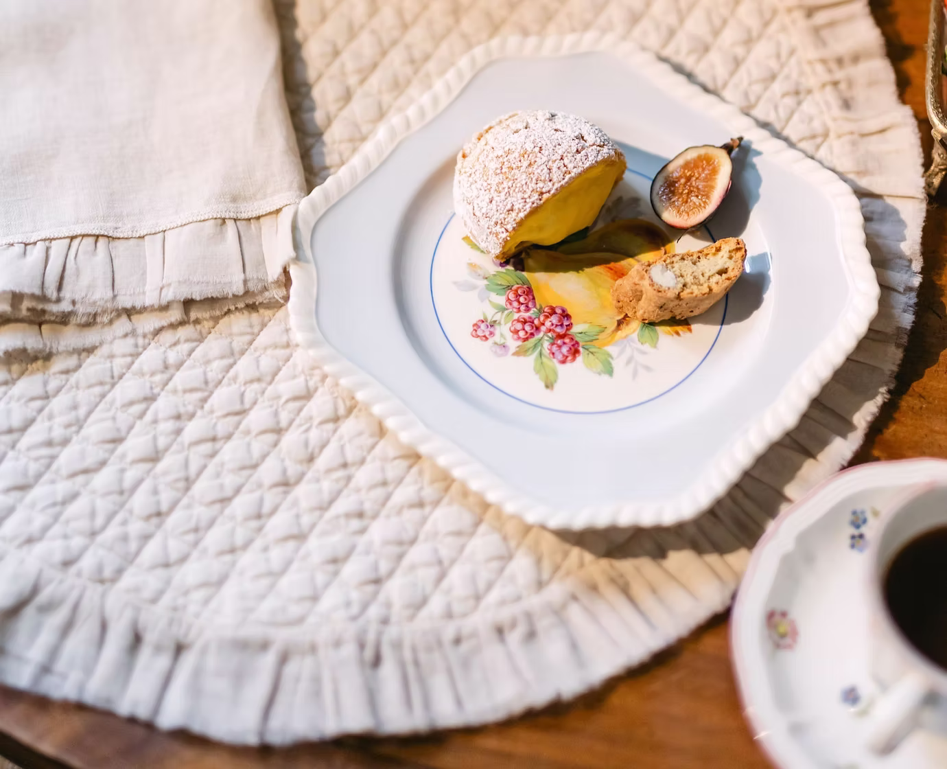 Circular placemats crafted from the softest oyster coloured quilted cotton, enhanced with a delicate linen ruffle, these placemats effortlessly elevate your table setting with a touch of refinement.