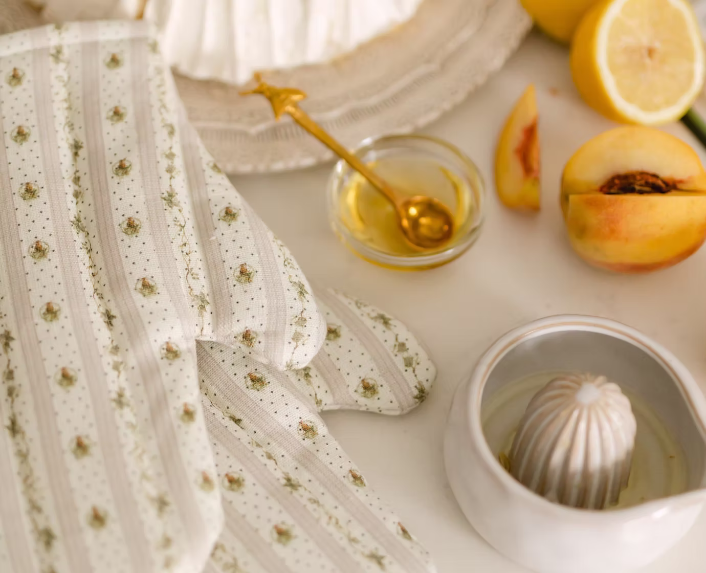 This darling Florentine inspired print adorns our linen printed oven mitts this season.
