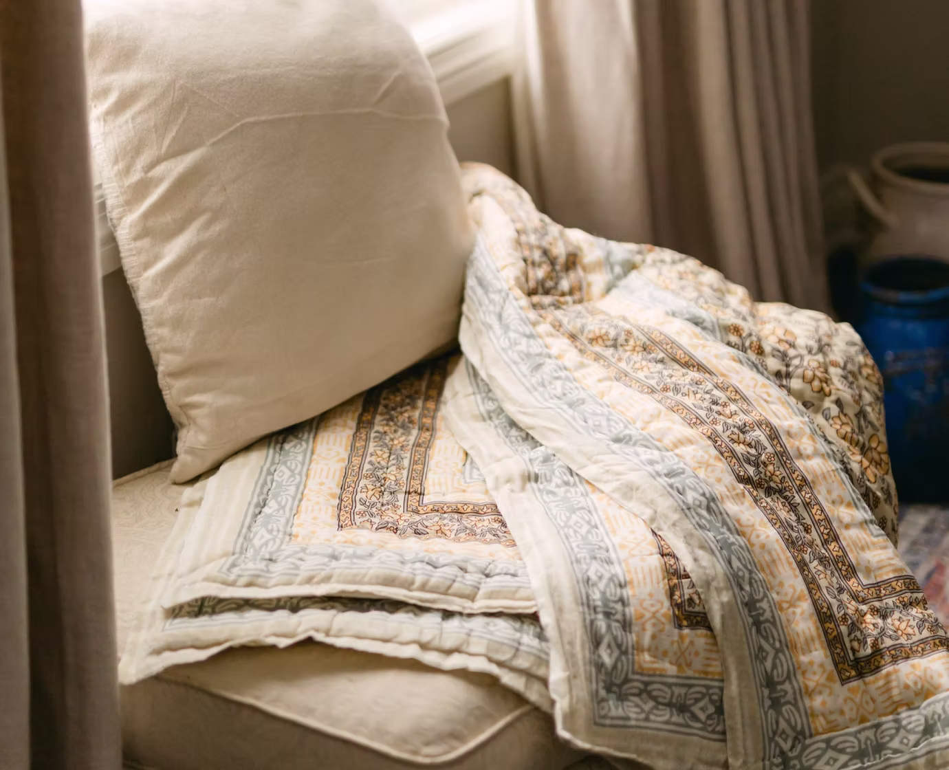 In soft shades of blue, butter yellow and sage green, its neutral vintage-inspired design is perfect for any cozy corner.