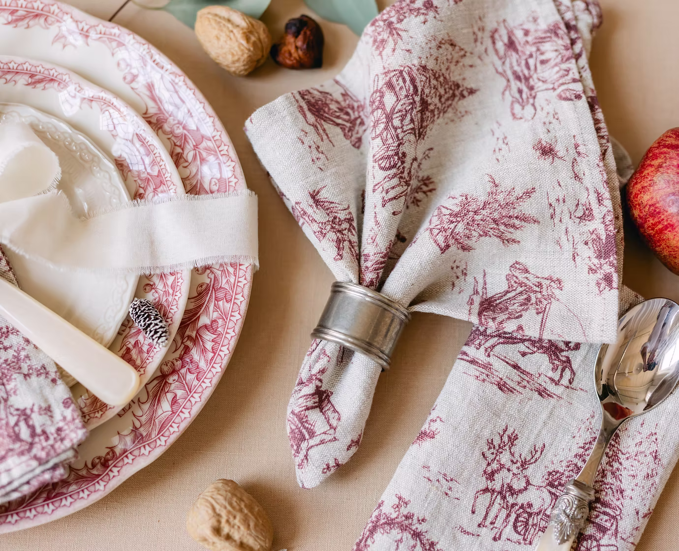 Crafted from soft, textured linen, they echo the rich burgundy tones and nostalgia of the collection, bringing warmth and charm to your winter gatherings.