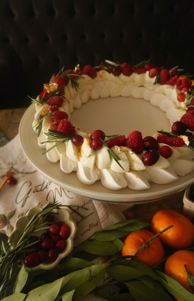 Cloud-like meringue shaped into a circle, topped with softly whipped cream, citrus, berries, or winter fruit — it’s both a centerpiece and a dessert. The kind of edible décor guests can’t stop talking about.