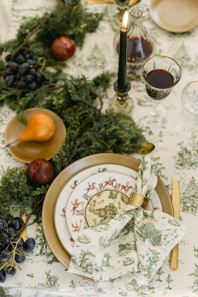 Loose linens, soft edges, gentle folds — draped fabrics create movement and romance. Think tablecloths that graze the floor, napkins casually tied or folded, layers of texture that make the setting feel lived-in and warm. Shop Winter Wonderland Toile here.