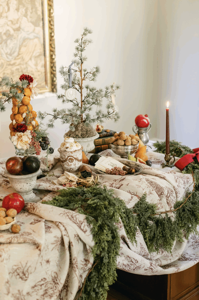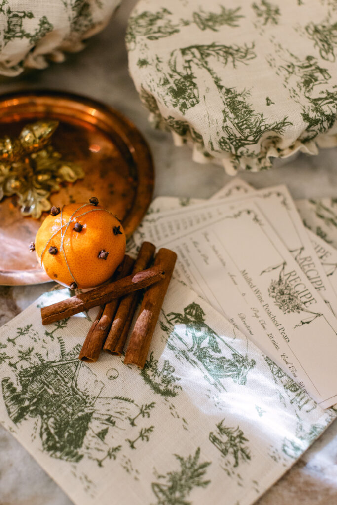 Pears, figs, pomegranates, oranges — beautiful on their own and even more magical clustered on a table. They add color, seasonality, and a quiet sense of abundance. Shop our Winter Wonderland Toile Evergreen tablecloth and napkins.