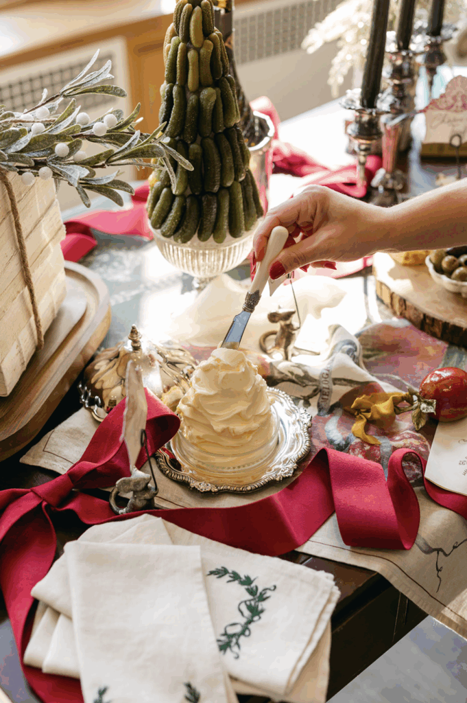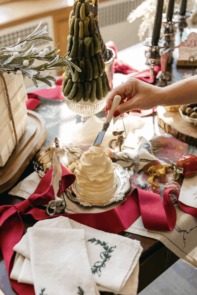 Tiny, sculptural “trees” made from pickles, pastries, or even stacked fruit add a playful, grazing-friendly twist. They’re whimsical without being kitschy — the perfect bite-sized nod to the season. If you’d like to make one yourself, you can find the full pavlova recipe here.