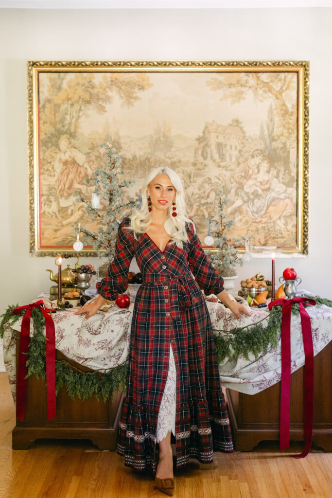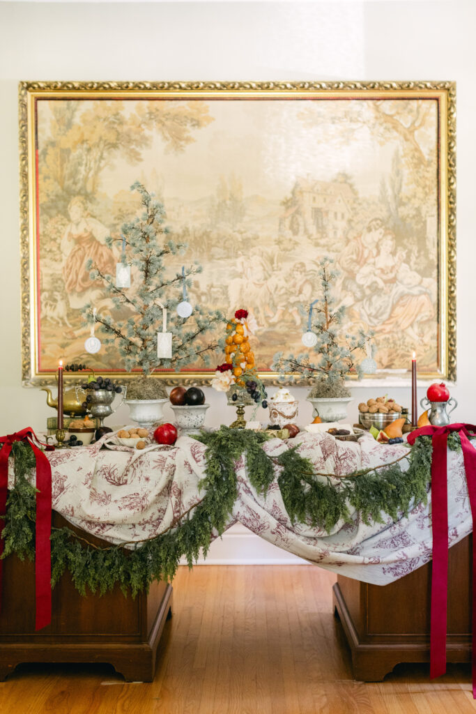 I draped the table in our Winter Wonderland Toile, which captures the serene beauty of the season with tiny vignettes that make the scene feel like a holiday storybook come to life. This linen has always felt like December wrapped in fabric: whimsical, nostalgic, and just a little bit magical. It set the perfect backdrop for a dessert spread rooted in tradition yet imagined through my lens.