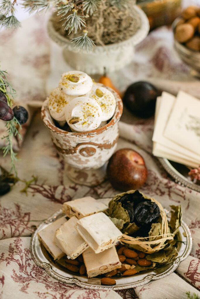 While the original Thirteen Desserts vary from village to village in Provence, they all celebrate abundance and the fruits of the land. I recreated the spirit of the tradition using ingredients I love and pieces that felt true to the season. As I began placing each sweet on vintage dishes and little trays, the table transformed into a quiet celebration of winter, heritage, and the joy of gathering.