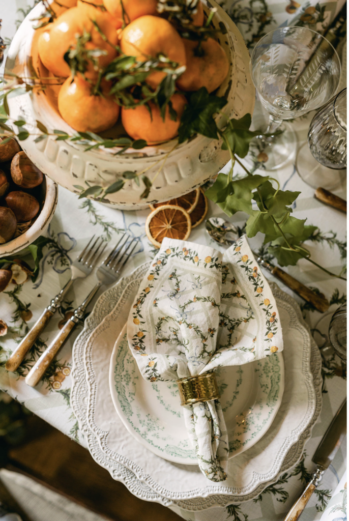 For a brighter, more sunlit take on a Provençal dessert table, I love layering the Clémentine de Provence Treillis tablecloth. Styled here it evokes that same warm, France in winter feel. The citrus motif feels playful yet elegant, a subtle nod to tradition, and pairs beautifully with nuts, dried fruits, and seasonal sweets.