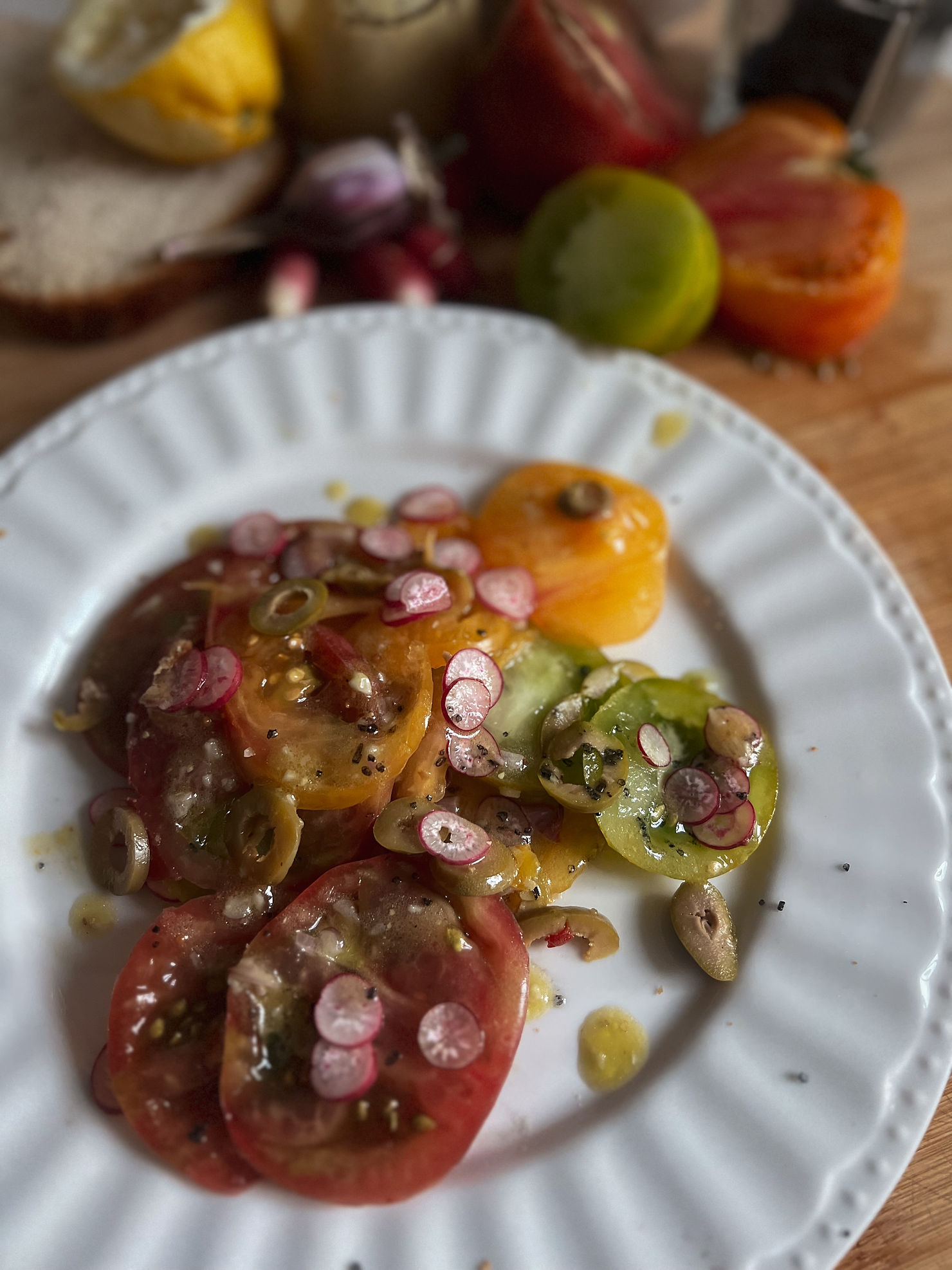 Thinly slice an array of heirloom tomatoes, green olives and radishes.