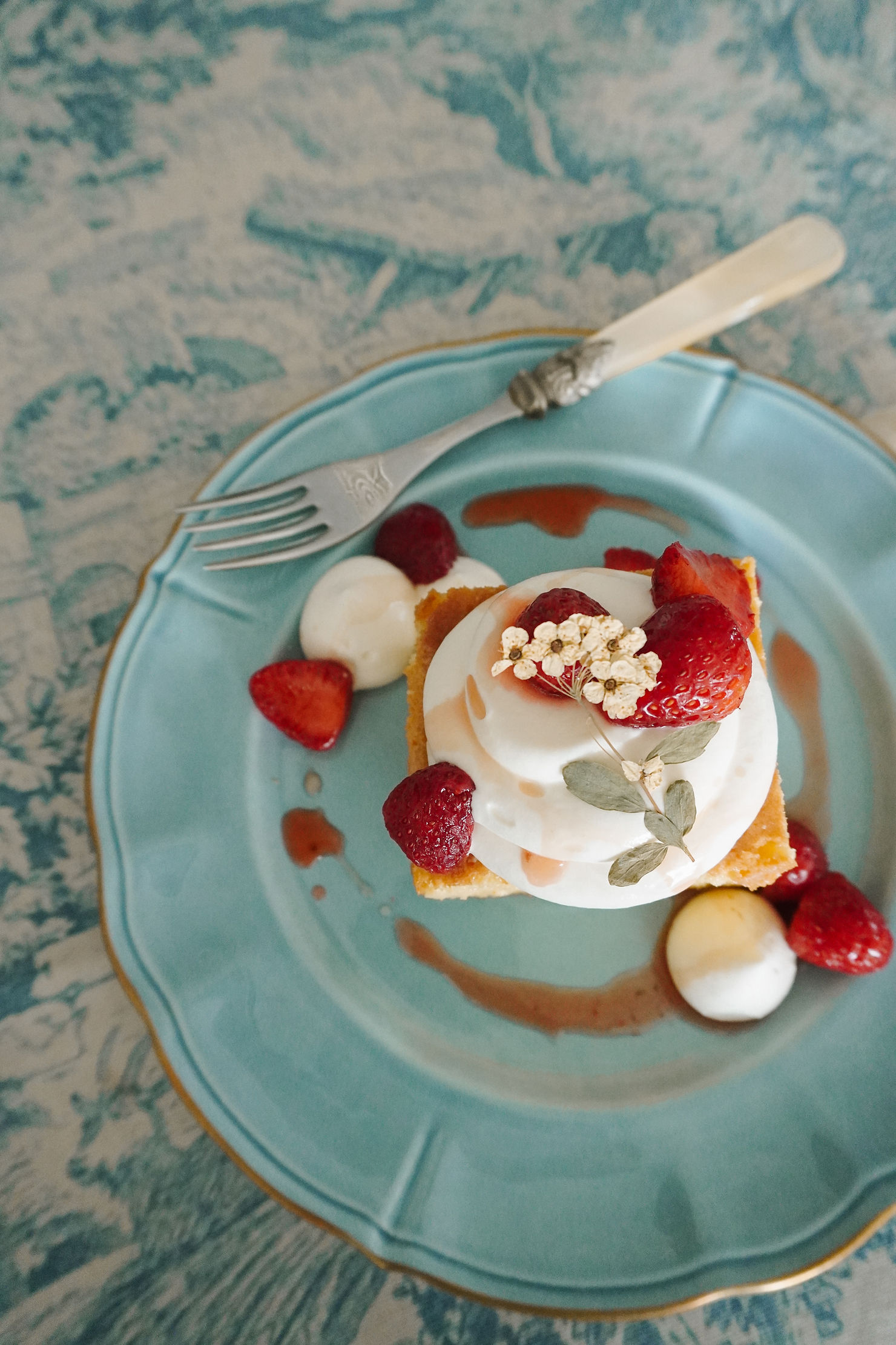 Pipe or top slices with Chantilly cream and surround and top the cake with strawberries.