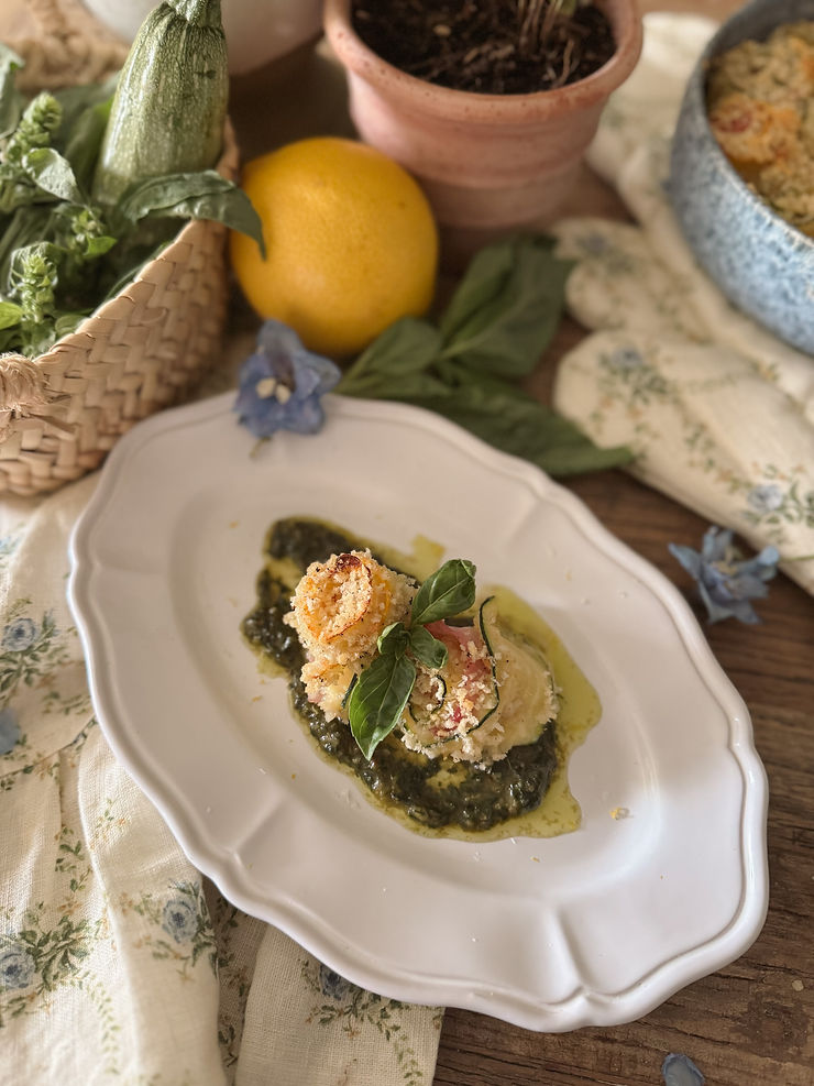 A delicate twist on a classic, these zucchini involtini are a celebration of summer’s simplicity and comfort. Thin ribbons of zucchini are lightly breaded, wrapped around melty provolone and savoury slices of prosciutto cotto, then baked until golden and bubbling. Served with a drizzle of fresh basil pesto, each bite is crispy, creamy, and herbaceous. Elegant enough for guests, easy enough for a weeknight.